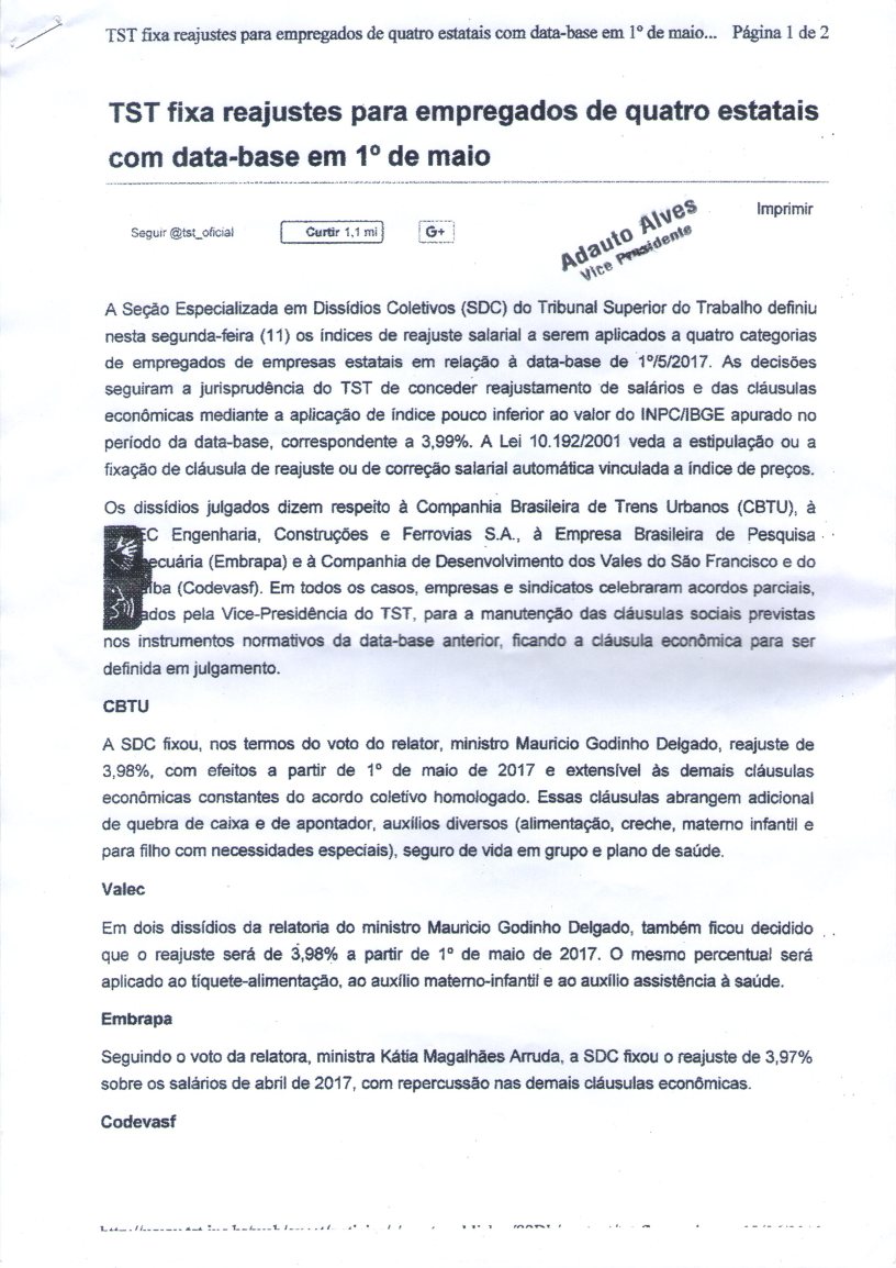 Com transparência para que não pairem dúvidas, àqueles muitas vezes desinformados ou mal informados, nossa intenção é apenas esclarecer a classe mais distante, embora o nosso mestre Abelha, o tenha feito em seu BLOG com toda competência, Dito isto, estou juntando o documento do TST com as informações aos dissídios ocorridos no dia 11/06, incluindo o nosso, ressaltando ser referente ao ano 2017/2018, quando definiu o índice de 3.98 % estabelecido pela União, ou seja, a inflação anual para todas estatais com data base 01/05/2017: CBTU, EMBRAPA, CODEVASF e VALEC. Ressaltamos que as três primeiras, todas com o poder de fogo, para promover graves e paralisações, a última onde os ativos da extinta RFFSA estão agregados, com menos chances. Queira ou não queira, foi uma vitória, que infelizmente não contemplou, ainda, as perdas de nossa tabela salaria.