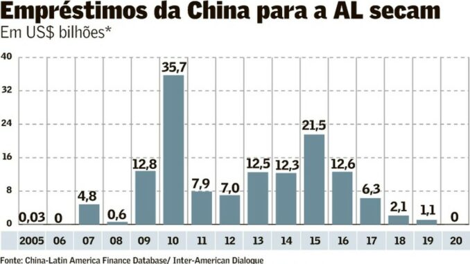 Ao analisar empréstimos do Banco de Desenvolvimento da China (CDB) e do Banco de Exportação e Importação (Eximbank) – bancos estatais que mais emprestam à América Latina – relatório do centro de estudos Inter-American Dialogue, de Washington, e da Universidade de Boston mostra que não foram emitidos novos financiamentos para governos nem empresas da região em 2020. O estudo diz que “a capacidade da China de oferecer financiamento de Estado para Estado “foi afetada pela pandemia, que também dificultou a execução de grandes projetos de infraestrutura” na região.