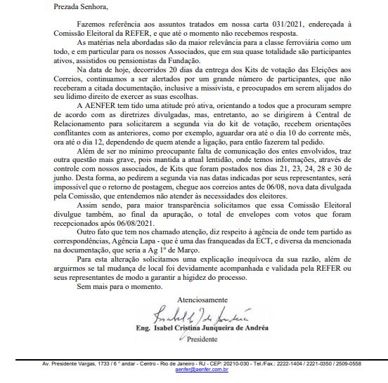 Em carta enviada â Comissão Eleitoral, a engenheira Izabel Cristina, presidente da Associação dos Engenheiros Ferroviários – AENFER, demonstra preocupação quanto os atrasos de kits com as cédulas para eleição de conselheiros deliberativos e fiscal.