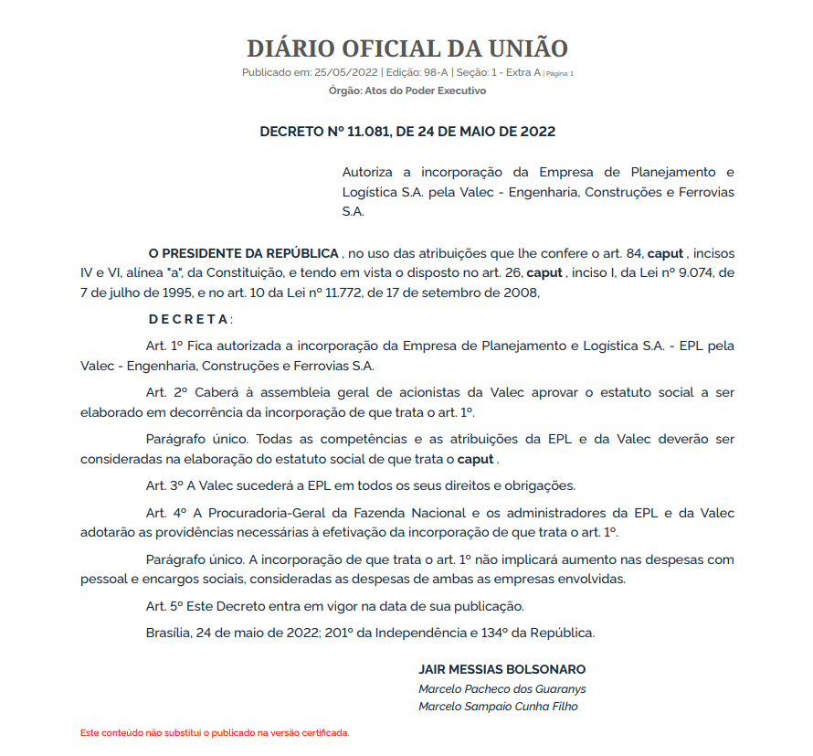 A VALEC – Engenharia incorpora a Empresa de Planejamento e Logística S.A – EPL, por decreto presidencial. Resta a dúvida de como ficarão os empregados transferidos da RFFSA para VALEC. Tudo indica que em nada serão beneficiados, de vez que o decreto prevê que a incorporação não implicará em aumento das despesas com pessoal e encargos sociais.