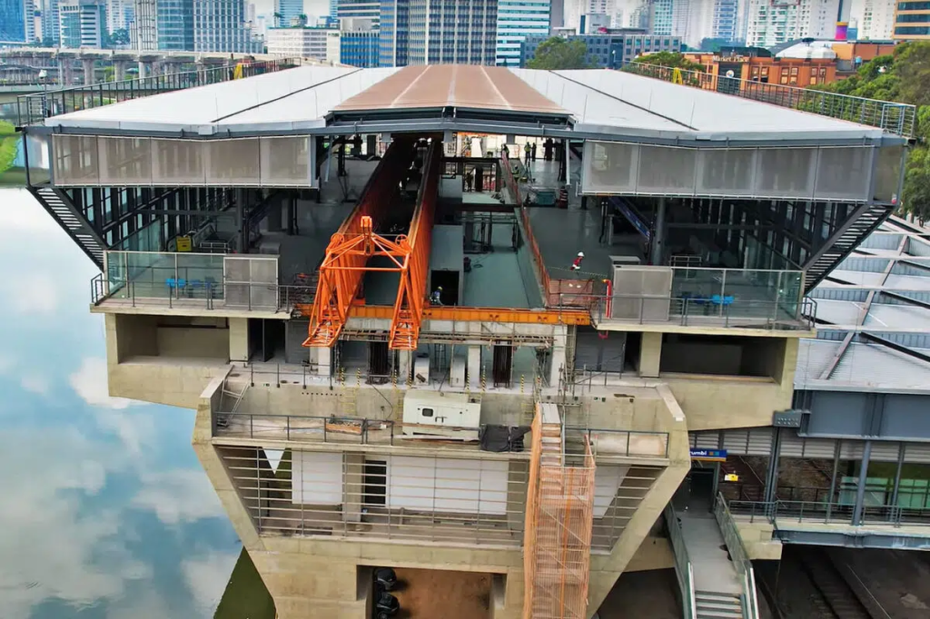 Metrô CPTM – A estação Morumbi da Linha 17-Ouro recebeu a primeira de quatro vigas-trilho. Imagens aéreas do canal iTechdrones mostram a estrutura posicionada ao lado da plataforma sentido sul, ainda com a treliça lançadeira sobre ela.