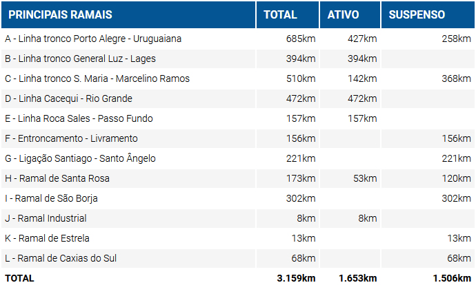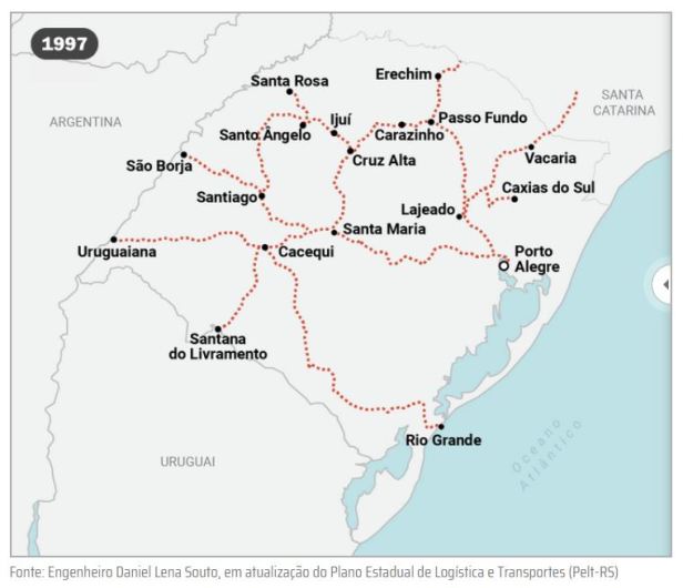 Trata-se da ferrovia, que, contrariando expectativas, ao invés de ser ampliada com investimentos, diminui cada vez mais de tamanho. Para se ter uma ideia, ao longo de 25 anos de concessão, a malha gaúcha perdeu 1,5 mil quilômetros de extensão. Dos 3,15 mil quilômetros ativos em 1997 — ano do início do contrato atual — restaram apenas 1,65 mil quilômetros, ou seja, praticamente a metade do traçado foi suspensa.