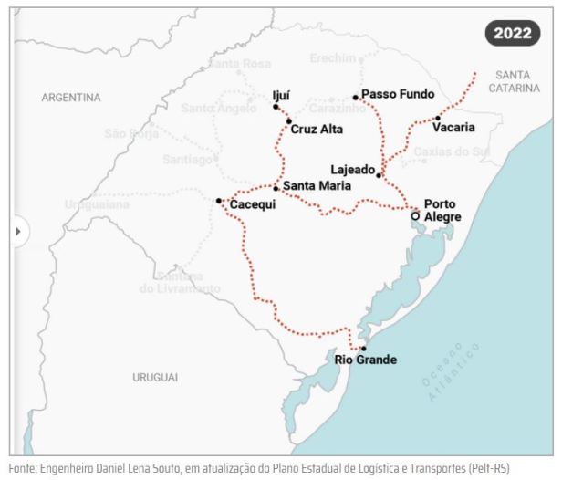 De oficial, todavia, existe apenas um pedido de autorização com trecho gaúcho no Portal de Transparência do Ministério da Infraestrutura , dentro do Pro Trilho. Trata-se do traçado de 1,5 mil quilômetros, que ligaria Arroio do Sal, no litoral do RS, a Terra Roxa, no Paraná. A análise encontra-se em fase de “compatibilidade locacional”, a terceira das cinco etapas previstas antes da liberação.