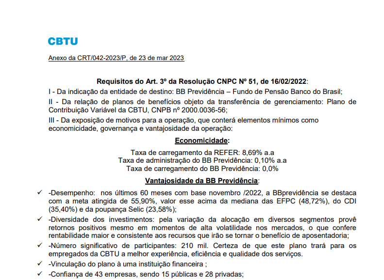 Eu como funcionário da CBTU, estou muito satisfeito com essa migração. Pois, além de tudo, o BB tem uma expertise bastante reconhecida na administração de seu fundo de previdência.