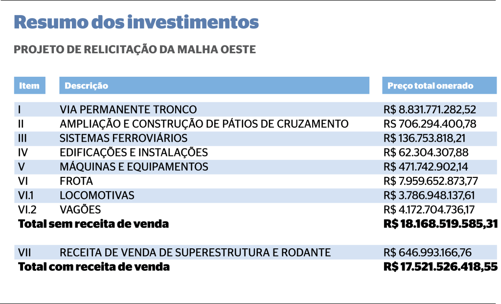 A nova concessionária terá de investir R$ 18,1 bilhões no prazo de 60 anos, sendo o maior valor, R$ 16,4 bilhões, nos próximos sete anos, na troca de dormentes e trilhos, compra de locomotivas, reforma de pátios de manobra, entre outras obras. A previsão é de que o volume de carga transportada seja 12 vezes maior em 2031.