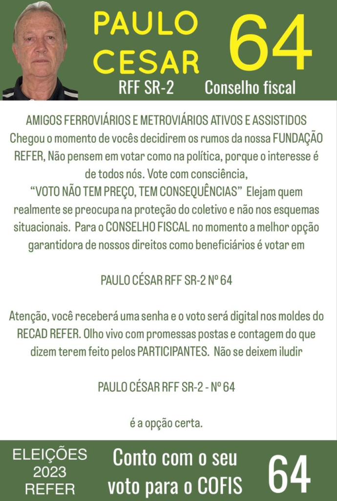 Caro colega de longa jornada ferroviária, agradeço o apoio e com certeza, a todos aqueles que me sufragarem nessa eleição, que se estiver lá como Conselheiro Fiscal, tudo farei para esmiuçar todo o desenvolvimento da Diretoria fiscalizando cada ato envolvendo nossas reservas financeiras em prol da participação dos beneficiários.