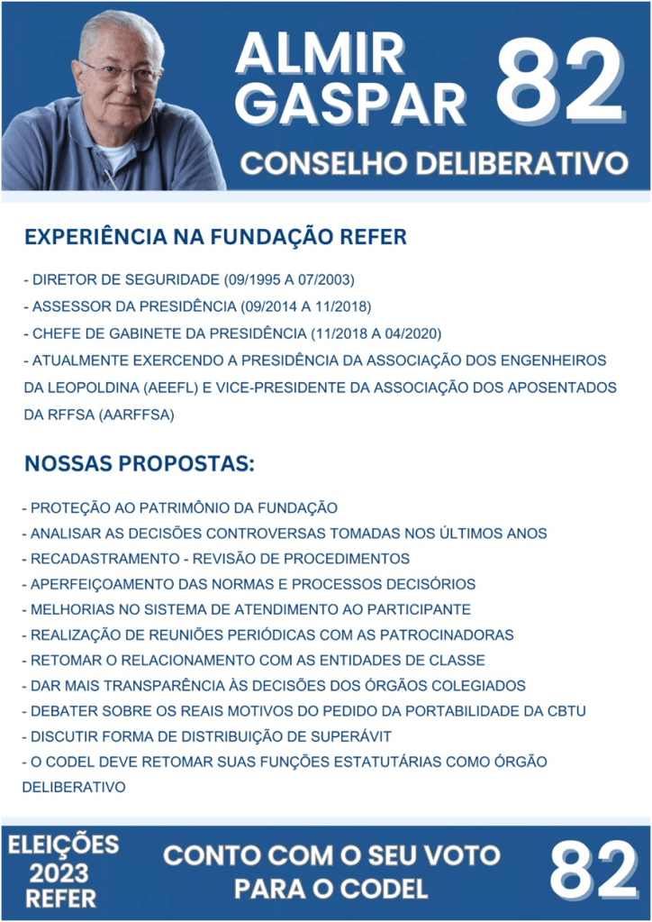 Dentre os diretores alguns se destacaram pela seriedade e compromisso com os participantes da nossa Fundação. O senhor é um desses diretores e nesse momento candidato a compor o nosso CODEL com número 82, não poderia me abster e deixar de me manifestar. Assim, coloco o meu nome junto ao seu e declaro apoio total a sua candidatura, por confiar e saber que nossa Fundação precisa dos seus conhecimentos e honestidade.