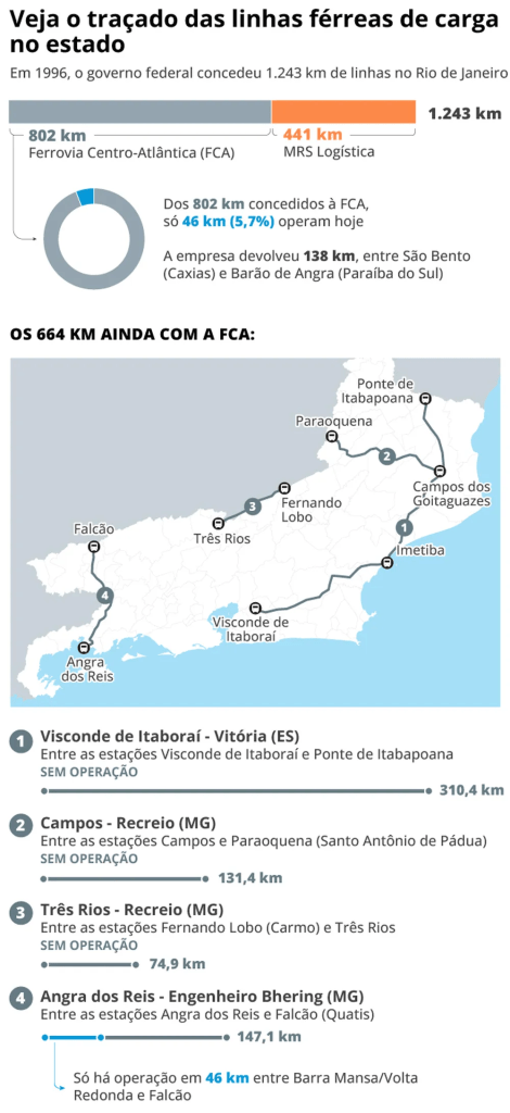 O que se vê em Lídice é uma amostra do que ocorre com a malha concedida à Ferrovia Centro-Atlântica (FCA) no estado, ligando municípios fluminenses a Minas Gerais e ao Espírito Santo. Ela encolheu, e não foi pouco. Dos 802 quilômetros de linhas que em 1996 passaram a ser administrados pela empresa (atualmente pertence a VLI), hoje apenas 46 quilômetros (5,7%) operam entre Barra Mansa/Volta Redonda e a estação de Falcão, em Quatis. Outros138 quilômetros (de Caxias a Paraíba do Sul) foram devolvidos à União em 2013, segundo a Agência Nacional de Transportes Terrestres (ANTT).