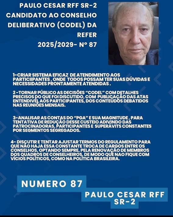 Estou candidatando independente de qualquer apoio, visto que assim, se eleito, me sentirei mais forte para acompanhar os trabalhos deliberados pelo Conselho, que se considerar prejudicial aos interesses coletivos dos beneficiários do plano, eu terei autonomia para me manifestar contra a proposta apresentada pelos órgãos dirigentes da Fundação.