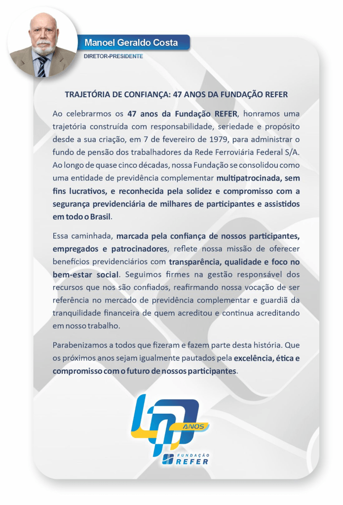 • Fundação REFER comemora 47 anos de sua criação, honrrando sempre a data programada do pagamento de aposentadorias e pensões